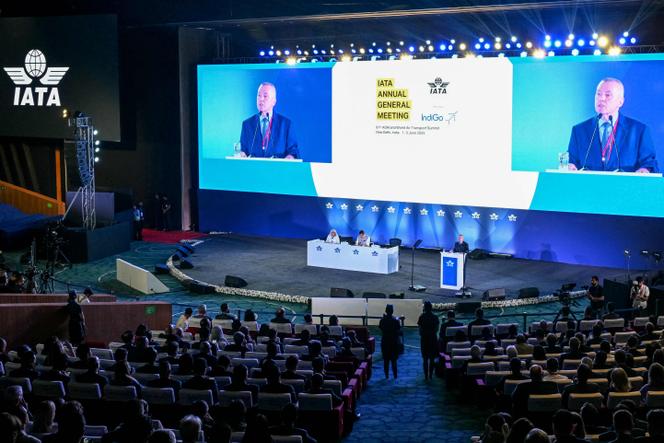 Willie Walsh,directeur général de l’Association du transport aérien international (IATA),lors de l’assemblée générale annuelle de l’IATA et du Sommet mondial du transport aérien (WATS) à New Delhi,le 2 juin 2025. MONEY SHARMA / AFP La visite solennelle du premier ministre indien,Narendra Modi,au rendez-vous mondial du transport aérien n’aura pas fait oublier un autre dirigeant planétaire,présent toutes les têtes depuis janvier. Car c’est bien un effet Trump qui a conduit l’Association du transport aérien international (IATA),réunie en assemblée générale du 1er au 3 juin à New Delhi,à annoncer qu’elle révisait à la baisse ses prévisions de croissance de décembre 2024. Contrairement à ce que ses dirigeants espéraient,le transport aérien ne devrait pas franchir cette année le cap des 1 000 milliards de dollars (875 milliards d’euros) de chiffre d’affaires. Pour l’ensemble de 2025,l’IATA table désormais sur un revenu global de 979 milliards de dollars.